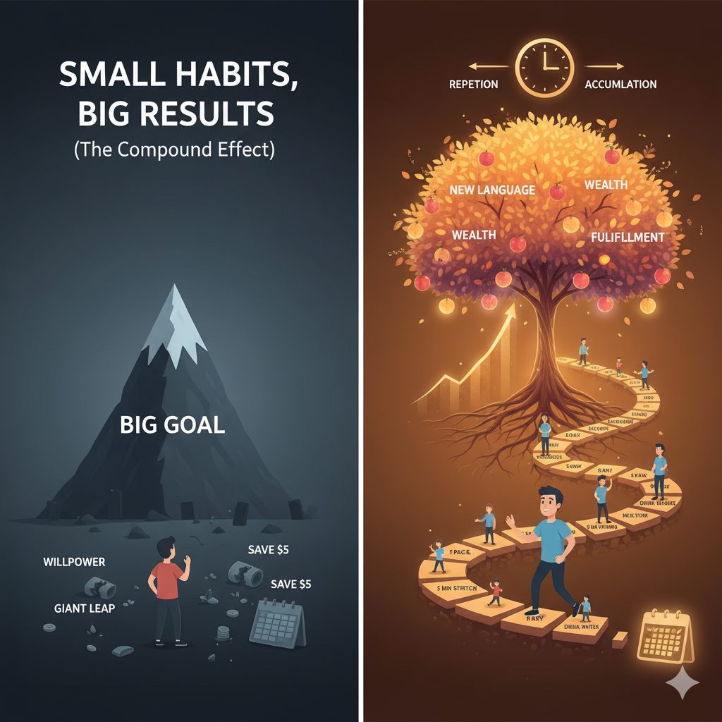 Whether it’s learning a new language, saving for a huge purchase, or totally changing our health, everyone has lofty aspirations and grandiose objectives. However, it can paralyze you to look at the huge difference between where you are today and where you aspire to go. We frequently disregard minor actions because we don’t think they are important enough to make a difference. But the reality is that a single courageous leap rarely results in a life-altering makeover. The compound effect’s patient, potent force causes it to happen gradually. Like compound interest in banking, the compound effect is a silent force that produces astronomical effects that seem to happen out of nowhere from little, persistent efforts taken over time. The magic isn’t in the action itself, but in its repetition and accumulation.