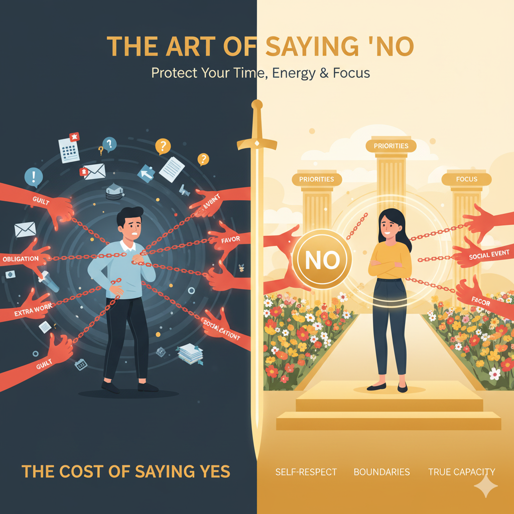 Changing your understanding of what “no” really means is necessary to become proficient in this skill. The goal is to preserve your “yes,” not to reject the individual. Saying yes to every request means you are unavoidably sacrificing your personal objectives, your sleep, and your mental health. To say “no” with discernment makes room for what you truly want to accomplish. A request is likely to be rejected if it conflicts with your energy level, your present objectives, or your basic values. By establishing these deliberate boundaries, you make sure that your final consent—your “yes”—is provided with zeal, sincerity, and from a position of true ability.